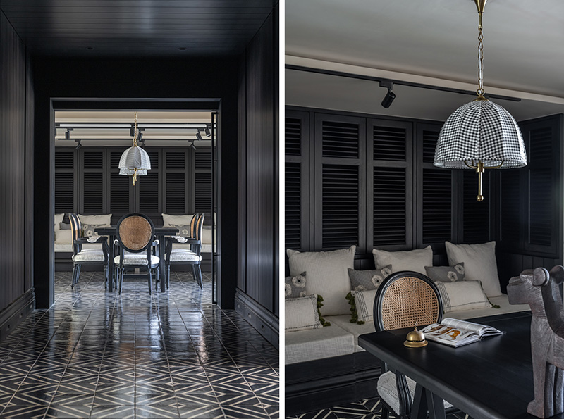 In contrast to the single-tone living area, the dining room blossoms with colour. Testament to the broadly travelled sensibilities of the designer, a series of geometric Suzani embroiderers from Central Asia are framed into art panels adorning the walls. This multicultural backdrop makes a romantic setting for the dark-washed dining table with stately turned legs and exquisite chairs moulded out of old Burma teakwood with the pendant velvet lights strumming an overture of hedonism. Nearby, a black-and-white contemporary mandir offers an intimate cocoon for becoming one with spirituality