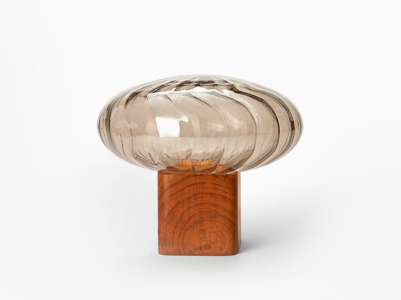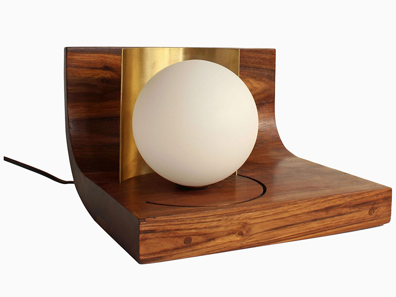 Simple and elegant, Indu is an alluring lamp crafted from reclaimed teak wood. It has a striking moon-like glass globe paired with an undulating brass shade that helps effortlessly transition from a table lamp to a night lamp.