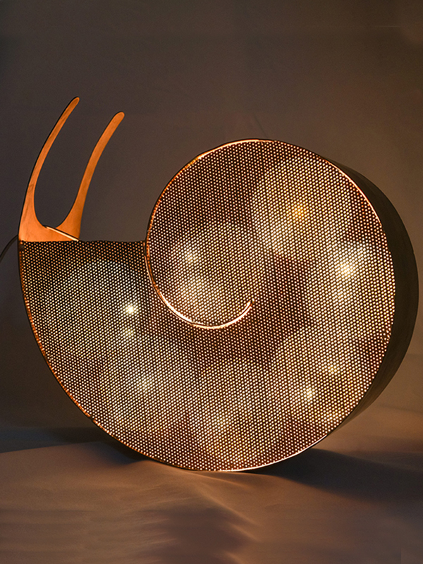 A truly imaginative piece, the Snail table lamp by Slightly Abstract stands out for its whirling shell design. The lights aka the snail’s glass body on the inside are protected by a copper metal shell which has a mesmerizing mesh design in the front.Â