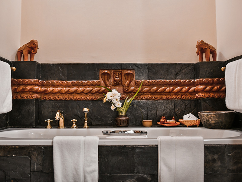 Organic linen, handwoven upholstery and cushions in crimson red and black are locally produced. The bathrooms in every room category are spacious, accoutered with locally sourced black slate, and kitted out with dual basins, a bathtub, a shower, and divinely scented soap bars and salts crafted using essential oils by Dwarika’s hospitality group. Every room is equipped with a host of amenities, ranging from a garment steamer and music dock to shoe-cleaning services.