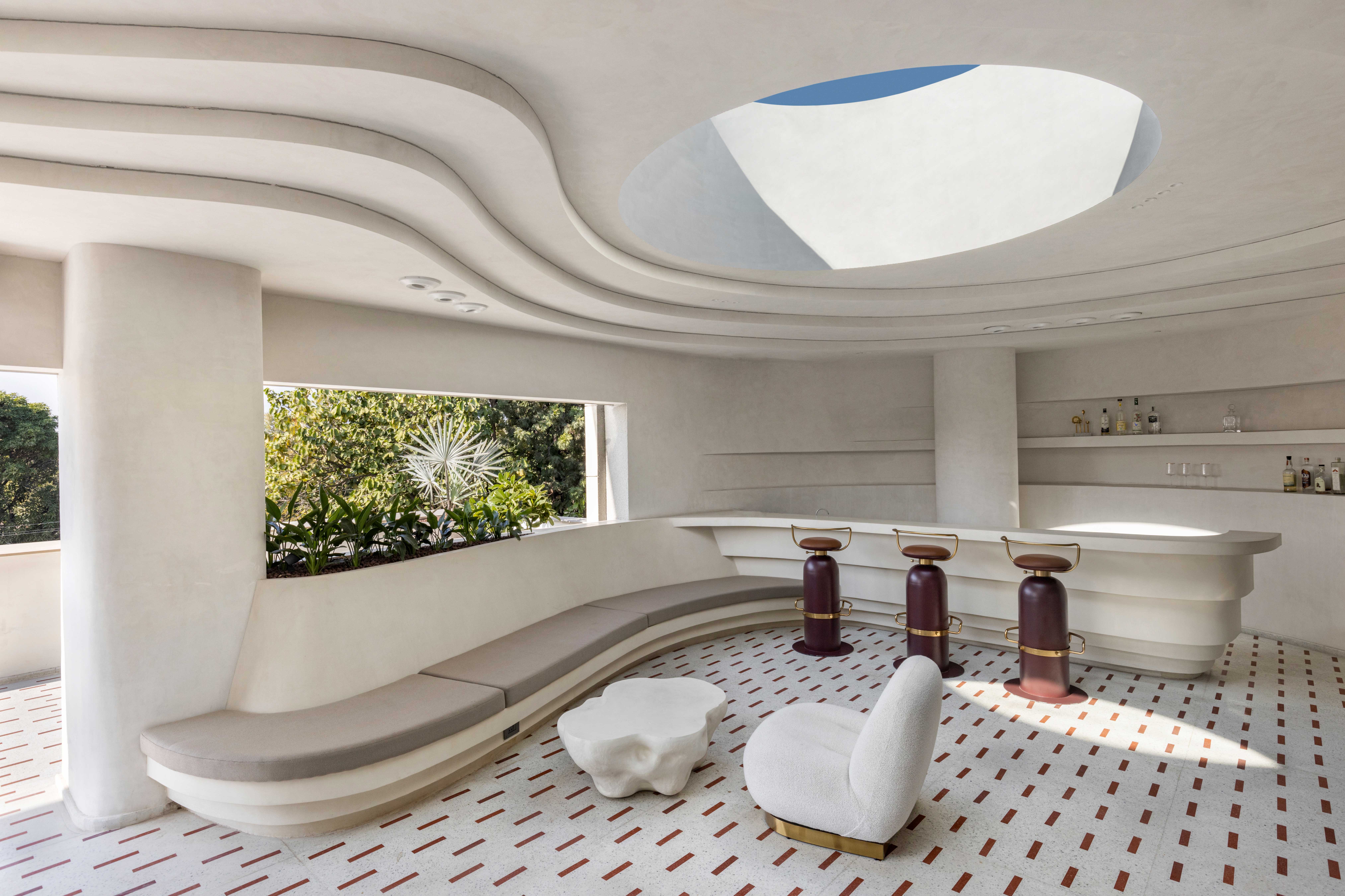 “This home’s design draws inspiration from the horizon, an ever-present boundary that appears static yet is in constant flux. This illusion of permanence and movement sets the tone for a home that is both structured and fluid, balancing stillness with transformation,” says Palak Singla. This sense of free-flowing bohemianism is most pronounced in the home’s uppermost volume called ‘Canyon Conversations’, a semi-covered lounge and terrace imitating a spaceship capsule ricocheting through the ether of time. Undulating contours ripple across the walls, ceilings, and floor, dissolving rigid linearity in favour of nifty alcoves, a bespoke bar and sci-fi themed skylights. Planters blossom organically from the winding silhouettes, suturing greenery into the spatial narrative, while a voluptuous wave wall carves out a secluded corner for languid conversations. Underfoot, the terrazzo flooring is artfully inlaid with Lakha Red Granite, resonating with the custom bar stools. The staggered ceiling, a masterstroke here, invokes the topography of rice plantations or extraterrestrial vessels from outer space.