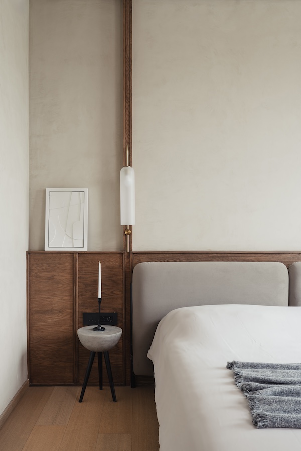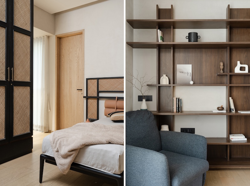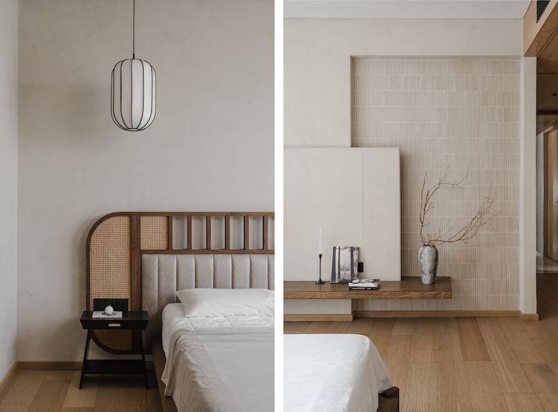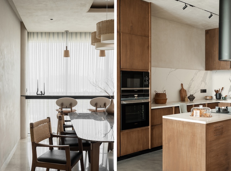 At its northern façade, a long granite bar emerging gracefully from a circular column sits under a pair of cork pendant lamps from Oorjaa. Right across the dining area, the open kitchen stays true to the Japandi aesthetic. Glossy white Bianco Statuario Venato ceramic from Stonelam makes a clean fit on the kitchen island and countertops against the warmth of walnut-toned cabinet shutters.
