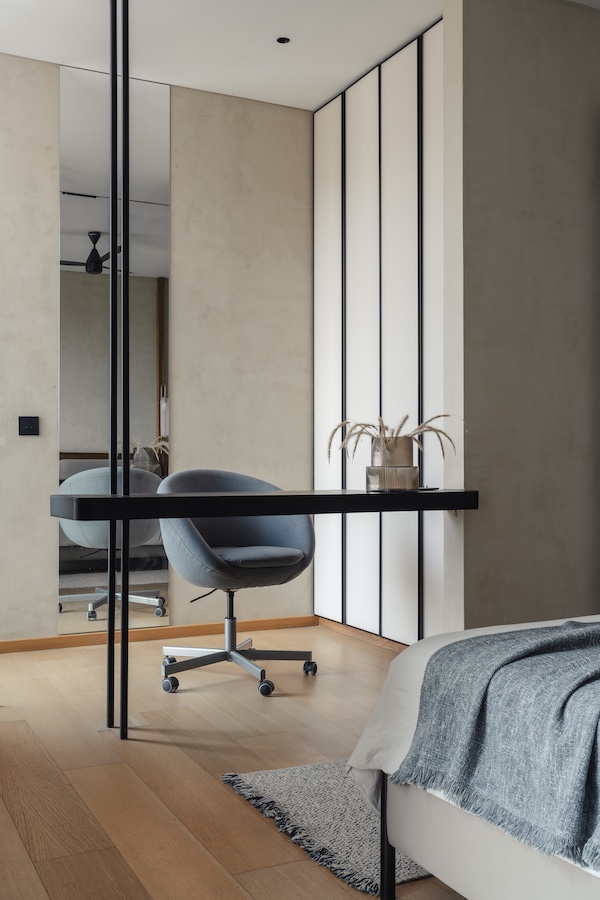 To enhance the multifunctionality of this room, the designers at Studio Poche went so far as to bring down a partition wall to accommodate a cantilever study table. Supported by metal rods, it’s a sleek and minimal addition to the guest room. A wardrobe featuring back-painted glass seamlessly integrates with the design rather than highlighting it.
