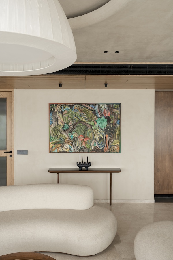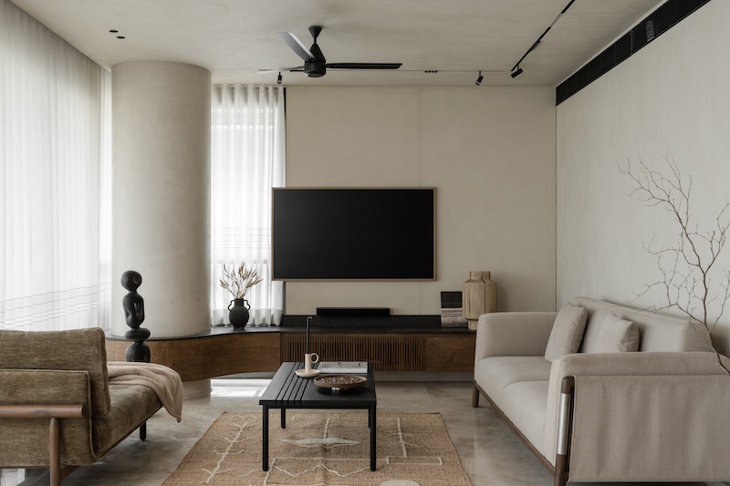 A fluid TV unit console decked in veneer from Decowood and topped with leather-finish granite by Jayantilal & Co. meanders through a circular column that allows light to filter in unhindered. A baggy sofa with a detachable backrest paired with a centre table atop a carved wooden tray was also customised by Pocho Living to suit the neutral mood of this home.