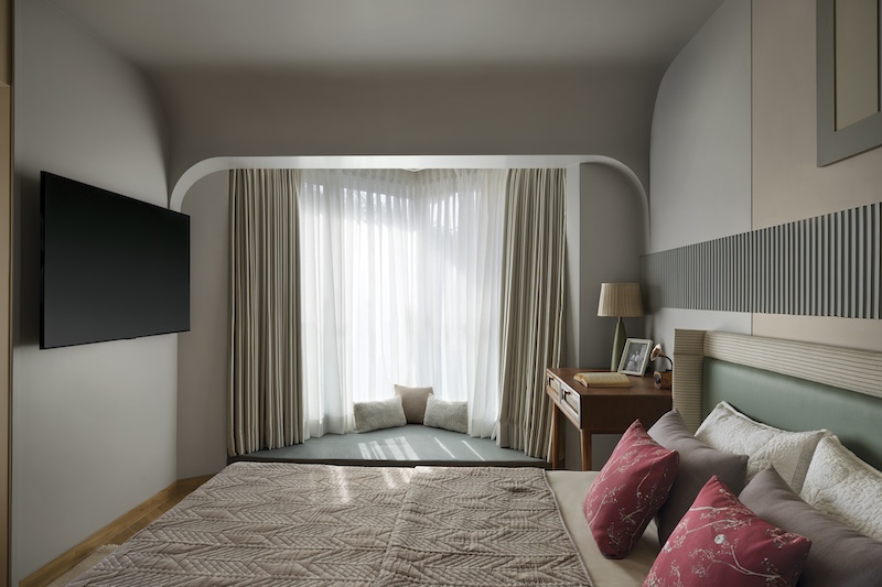 The second bedroom reflects meticulous attention to detail that can be seen elsewhere in the home, as rattan and polished wood make a comeback on the study table while the signature gramophone artefact gleams lambently with an elegance of its own. Here too, a baritone of curved walls, a Tudor-inspired flat archway and nostalgic, corner window seating resounds with admirable consistency. A flourish of ribbed detail panelling above the headboard contributes to the manifold textural palette, while the muted bed linen and ornate cushion covers weave in a soft, tasteful homeliness.