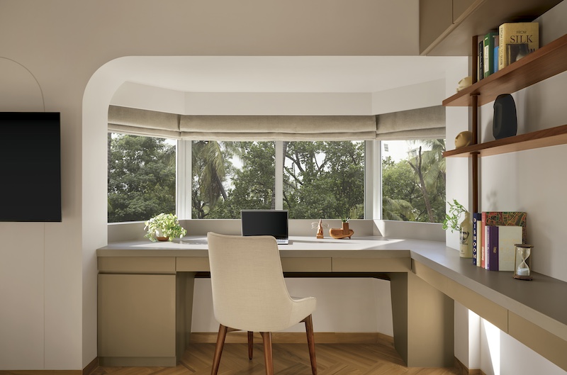 Nowhere is an ergonomic, dual-purpose design more necessary than in the study that also morphs into a parlour and spare bedchamber for the family’s inner circle. “This transformation is made possible by the clever addition of a Murphy bed adorned with captivating artwork,” Ar. Shewa shares his trade secrets. “Not only does this innovative feature save space, but it also injects a playful charm into the room.” The side table embellishments have been intuitively culled from Razia Tyebjee’s boutique studio Details Decor elevating this room with a surprising duet of individualism and sustainability. An elegantly arched compass window makes the study feel bigger and brighter, adding dimensionality to compose an alcove for a wrap-around workstation.