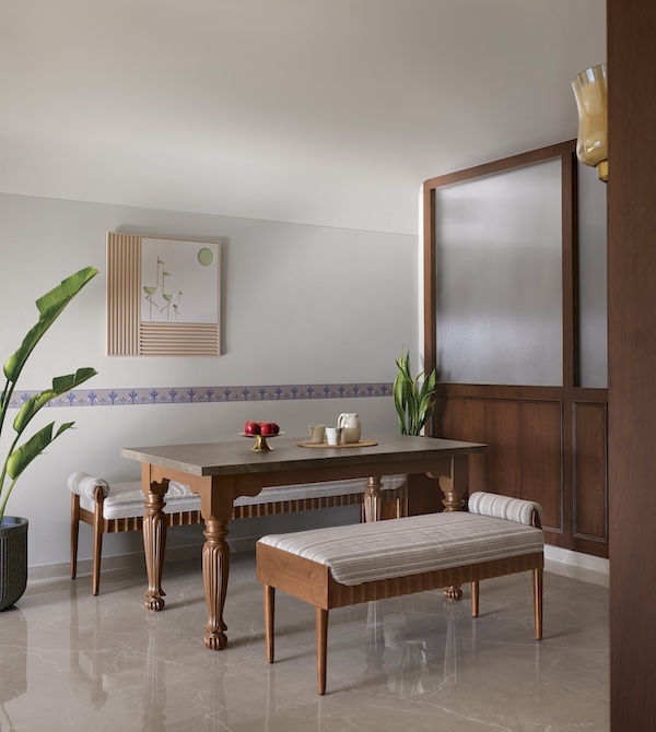 With the ingenuity of a mischief-loving visionary, Ar. Shewa places tiny gramophone replicas all over the house — like so many collectable Easter eggs — conferring a personalised touch that is commendable for its sublime inconspicuousness. Adjacent to the living area, the dining space in Summer Opera becomes a focal point for gatherings, teeming with a variety of mid-century influences. The marble-top colonial dining table boasts elaborately detailed legs, with a bulbous top and reeded tapering shafts. A pair of attractive L-shaped designer benches rest against clean white walls coated with Asian Paints and sitting down, one has the panorama of being embraced by a proto-Bauhaus dado rail. Like a Dutch still life brought to reality, one cannot help being infected by a sense of whimsicalness here.