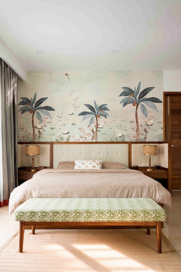 This tropi-core ambience is reinforced in the younger daughter’s bedroom where wallpaper “creates an intimate atmosphere that mirrors the natural beauty of Kerala,” notes Pyarelal. In this pristine room dotted with wooden and rattan accents, a tropical-inspired wallpaper behind the headboard becomes the pièce de résistance, exhibiting verdant flora, lofty palms, graceful cranes, and indigenous flora and fauna. The wallpaper evokes a sense of nostalgia, humming tunes of warmth and tranquillity that enhance the tropical spirit throughout the home.