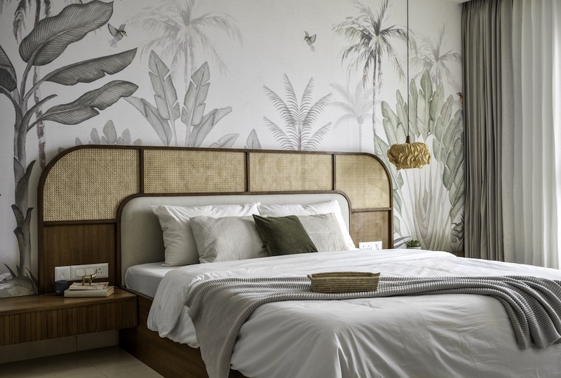 Offering a slice of paradise amidst Bangalore’s bustling routine, a dining room wallpaper adorned with intricate yet delicate illustrations materialises, in keeping with the home’s minimalist allure. Basking in the airy environment, paired with rustic accents, the wallpaper’s graphite art—depicting dainty flora—pays homage to Karnataka’s coastal towns. The dining area’s placement reveals glimpses of the bedroom, where scenes from the lush, golden beaches unfold. “Its lively patterns and natural tones create a refreshing contrast to the otherwise minimalistic décor,” notes Umesh. The floor-to-ceiling tropical-themed wallpaper, showcasing monochromatic landscapes of flora and fauna, whispers tales of an oasis by the sea.