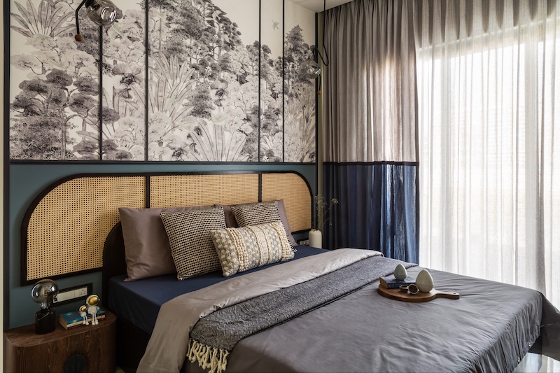 Right from the entrance, the space manifests tranquil minimalism with bespoke wood and wicker furniture paired with wallpapers. For instance, the wallpaper in the dining area from Mockingbird Studio showcases a lush depiction of verdant banana trees, the master bedroom bursts with tropical hues that infiltrate the senses. A flamboyant verdant wallpaper dotted with pink hues from Life & Colours, framed by wood. Flanking the master bedroom is the son’s bedroom, suffused in Persian blue hues that evoke the town’s majestic blue beaches. While the wood and wicker accents embed neutral tones, the monochrome wallpaper from Kalakari Hathi illustrates silhouettes of flora, subtly blending into the neutral palette. This oasis blends tropical elements with minimalist design, using nature-inspired wallpapers and natural materials to create a vibrant, and serene sanctuary.