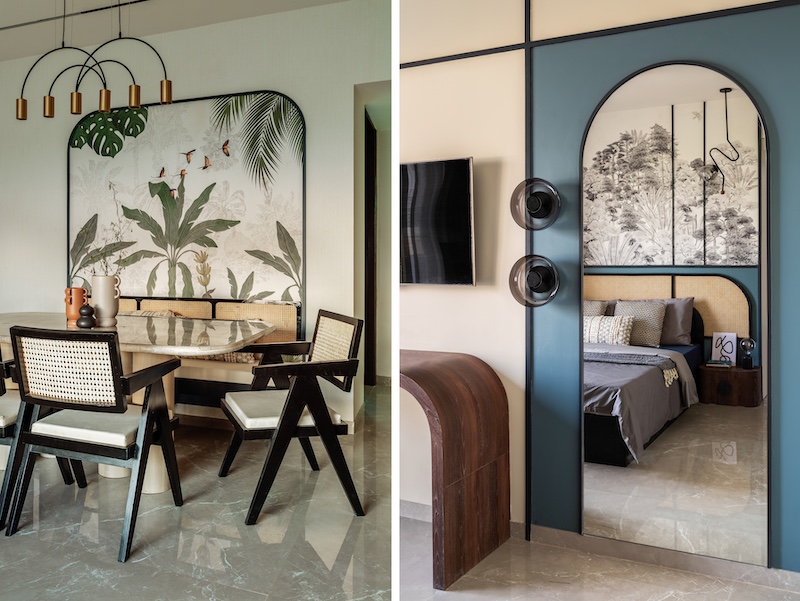Left: The dining area with bespoke rattan and wood furniture is set against the tropical-themed wallpaper from Mockingbird Studio infusing a serene vibe. Right: The monochrome wallpaper from Kalakari Hath balances the vibrant Persian blue in the master bedroom. (Image Credits: Anuja Kambli)