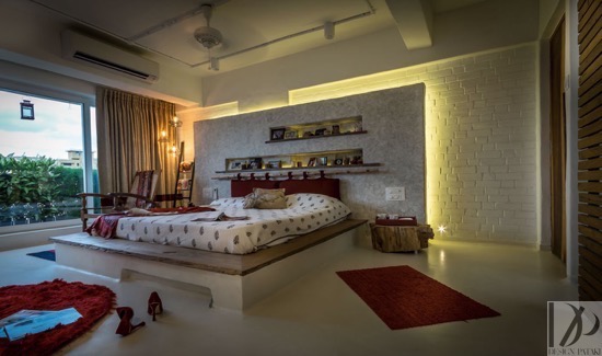 The bedroom was designed to function more like a family room so there’s a huge bed with wooden trimmings and a bamboo pole with cushions. The wall is textured with a hint of glittery paint one side is exposed brick. Attached is a walk in closet made of plumbing pipesย leading to the master bathroom. Here we have an old stone bowl used down south to make the idli batter which has been given a new life as a basin. Sandstone has been clad all through the bathroom and sealed for protection with brass lamps and stone to accentuate the area.