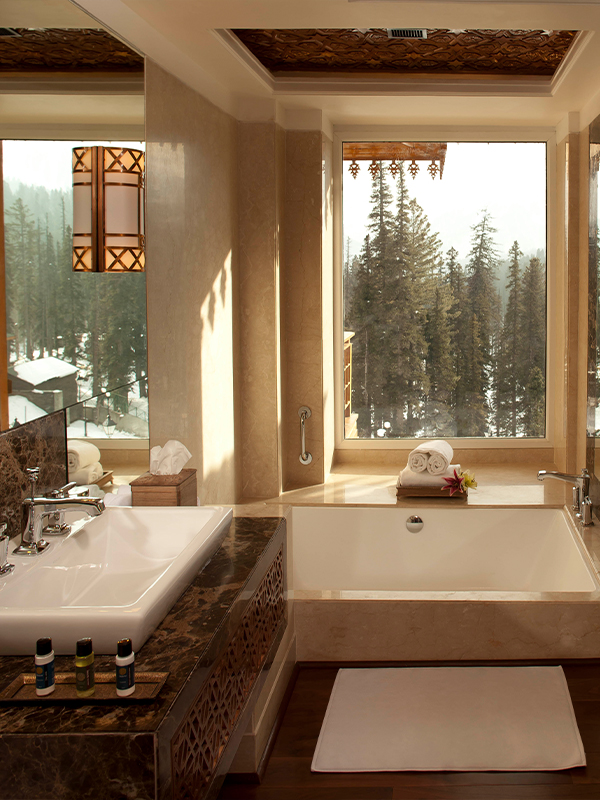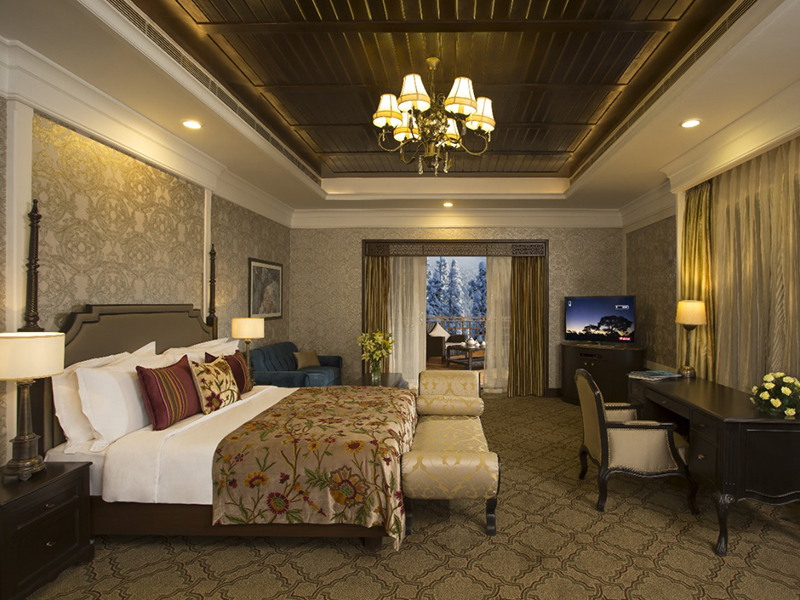 There are 80 luxurious rooms, four duplex cottages, and one presidential cottage. The luxury balcony Himalayan View Room is recommended. it comes with antique-designed furniture, flooring draped in silk carpets, a four-fixture bathroom design, and the room space sheathed with crewelwork fabric emanating warm colours with hues of gold. The luxurious architecture also follows you into the private jacuzzi decked in a richly designed Khatamband ceiling. The in-room infotainment and amenities all cater to five-star categories and above. In an endeavour to achieve design innovation, all the luxury rooms combat the sub-zero temperature as they are retrofitted floorings that heat up automatically.